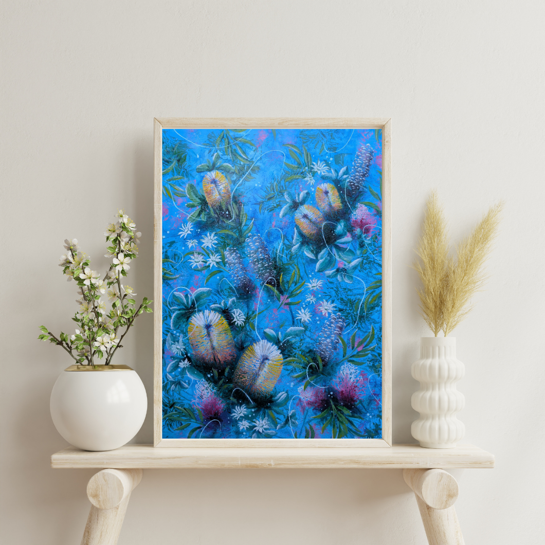 This painting captures the delicate beauty of Australian bush wildflowers, focusing on the iconic banksia rendered in soothing blue hues. It brings a serene and natural touch to any space, celebrating native flora with artistic elegance. Ideal for those who appreciate nature-inspired art and the unique charm of Australia’s wild landscapes.