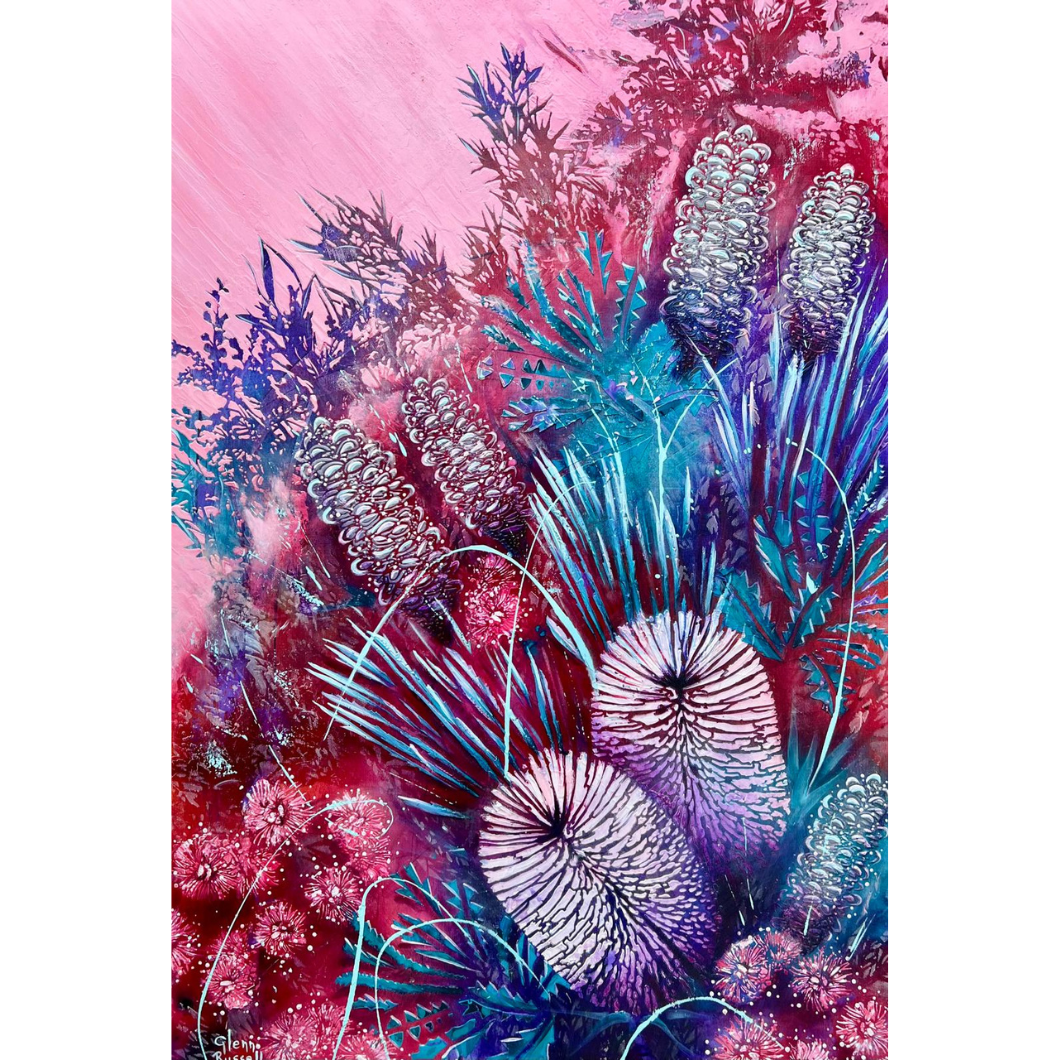 This painting captures the vibrant beauty of the Australian bush, featuring delicate banksia flowers rendered in soothing pink, purple, and green hues. Its rich colours and natural subject matter bring a touch of the outdoors into your space, making it a perfect piece for nature lovers and art enthusiasts alike.